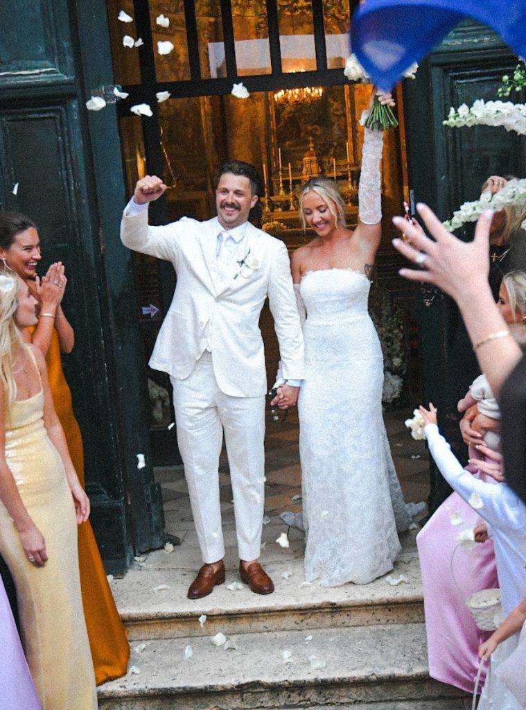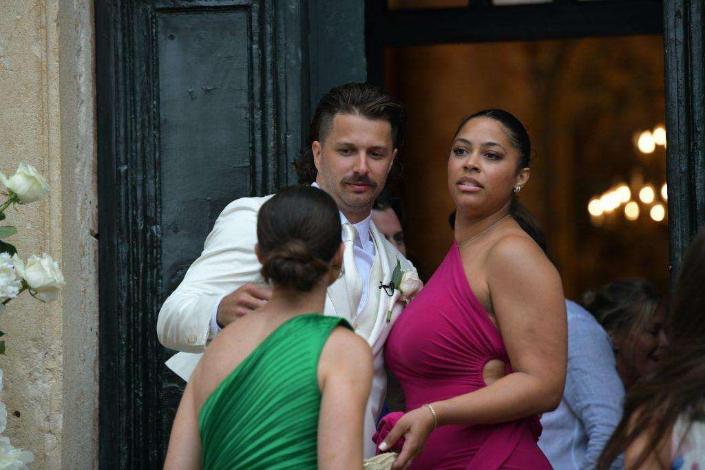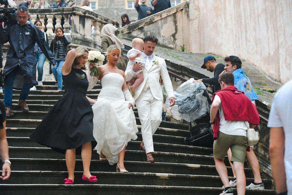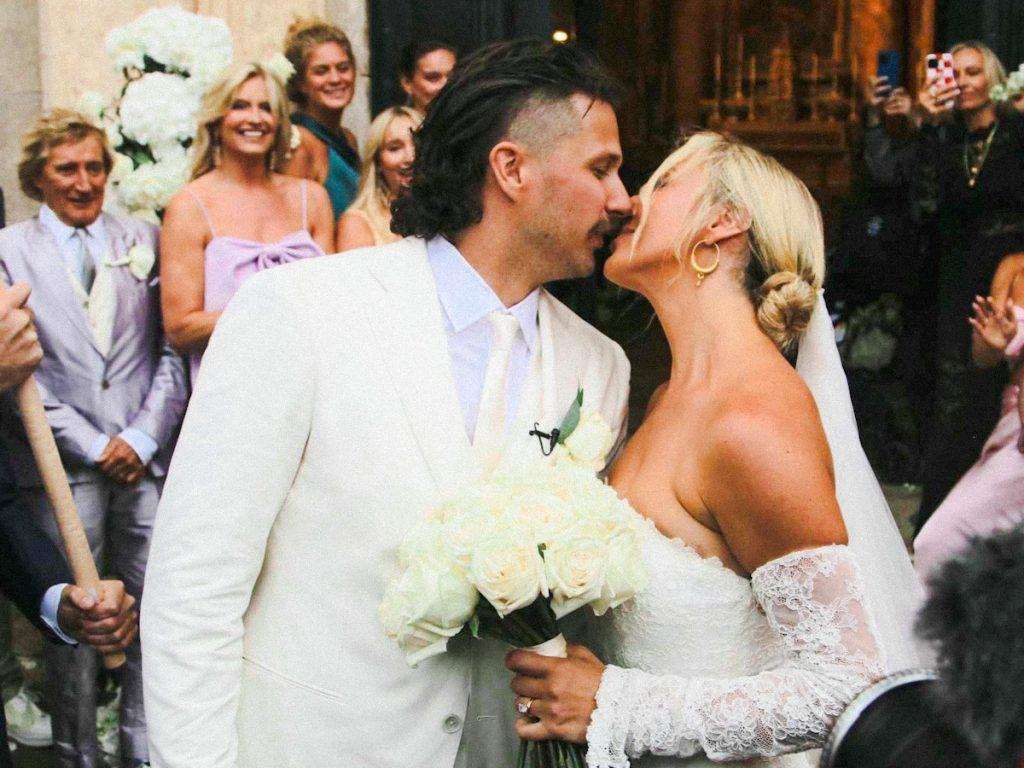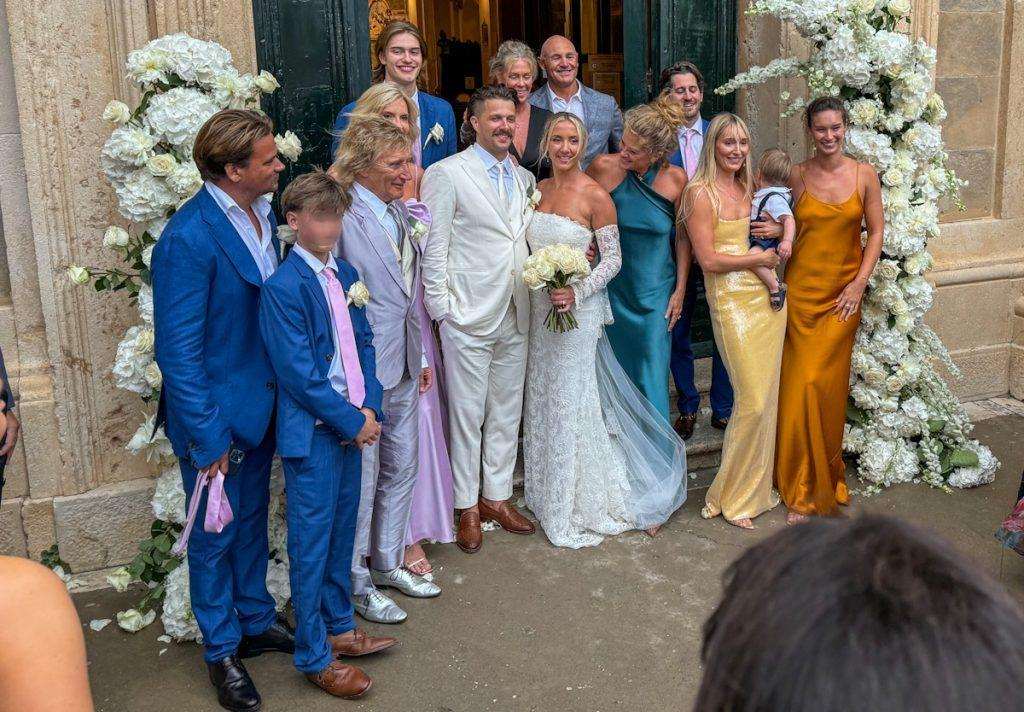 Liam Stewart and Nicole Artukovich have tied the knot at beautiful St. Ignatius Church on the Jesuit Steps in Dubrovnik. Among the guests was Liam’s famous father, Sir Rod Stewart, who attended with his wife, Penny Lancaster. The couple wore striking light purple outfits.