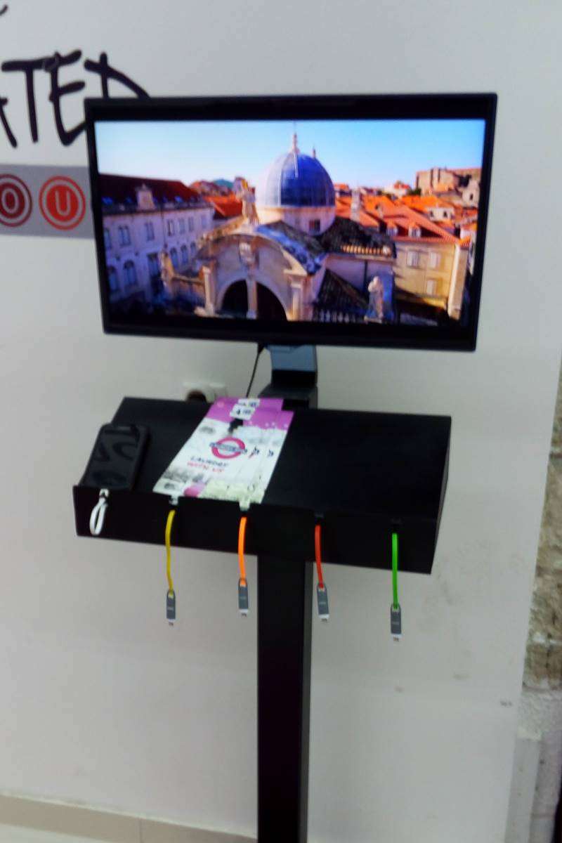 What is it all about? Storm Media offers standalone device, multicharger that has five chargers for android devices and tablets, as well as for iPhone5 and iPhone6 mobile phones. But the most interesting part of the story is 24 – inch screen on the top of the chargers, where you can present your restaurant, transport service, adventure park… Whatever you want to offer, and thanks to Storm Media, visitor of Dubrovnik can now explore the city virtually while waiting their battery to be ready for new pictures, selfies, messages…